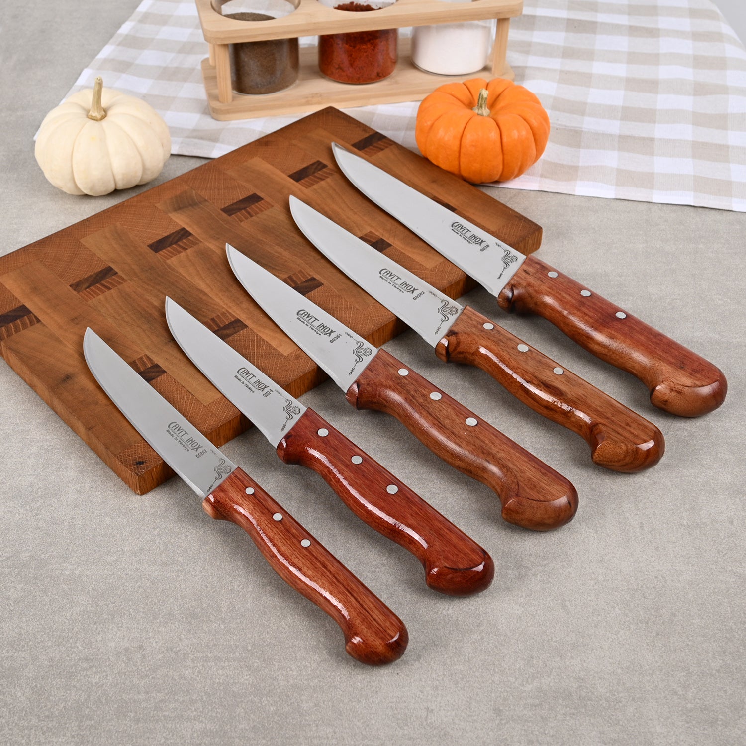 Mutfakta hem estetik hem dayanıklılığı bir arada arayanlar için özel olarak tasarlanan bu set, tamamı paslanmaz çelikten üretilmiş 5 adet bıçaktan oluşur. Kabze kısmında kullanılan Afrika menşeili Gül Ağacı, özgül ağırlığı yüksek, sert yapısı ve uzun ömürlü dayanıklılığıyla bilinir. Doğal dokusu sayesinde her bıçak benzersiz bir görünüme sahiptir.
